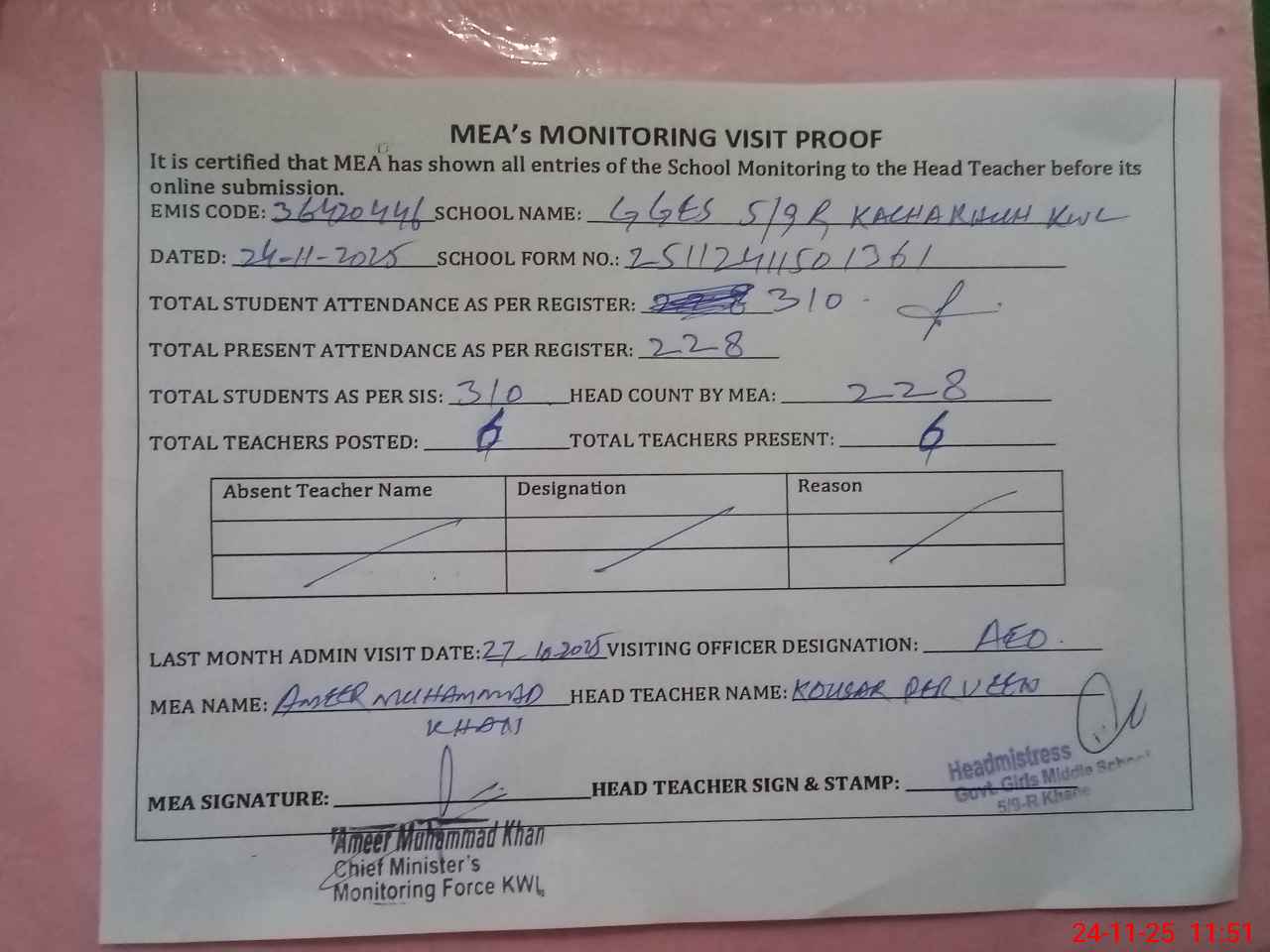 | Attendance Register | Head Teacher | MEA with School | Visit Proof |
