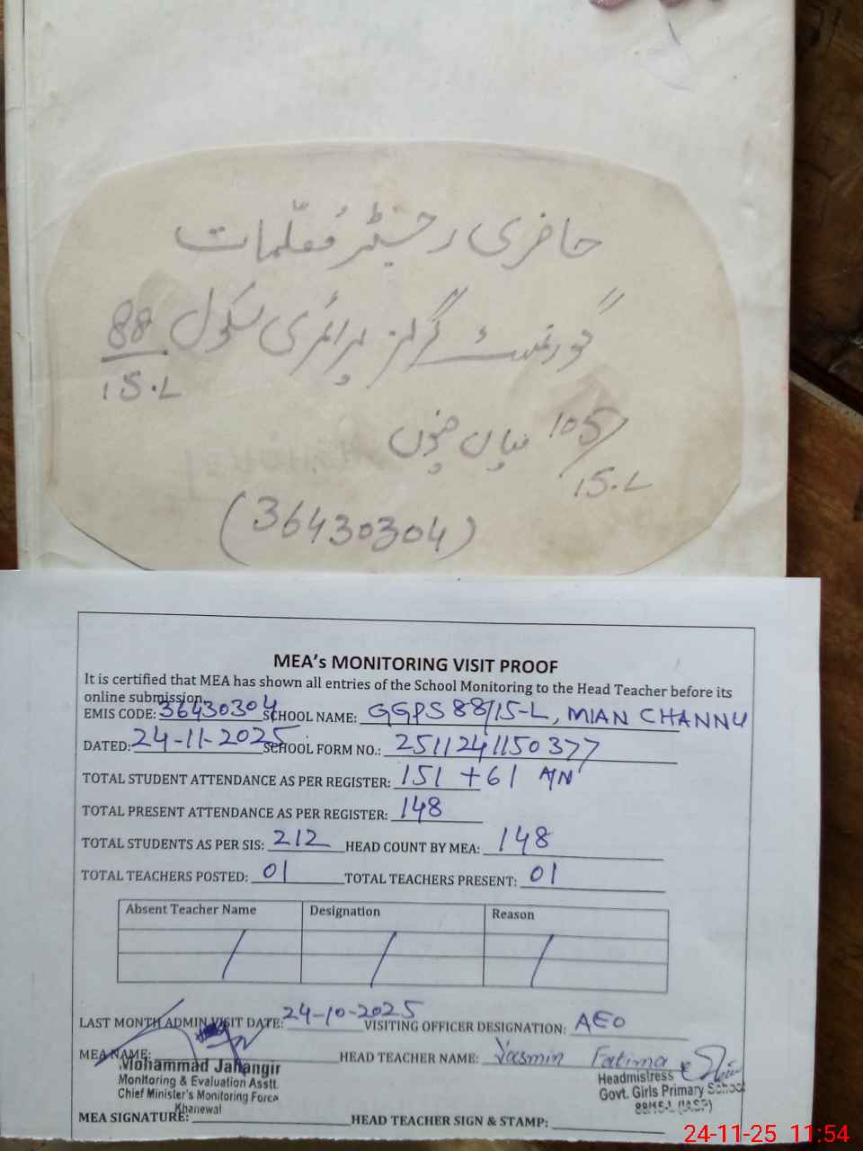 | Attendance Register | Head Teacher | MEA with School | Visit Proof |
