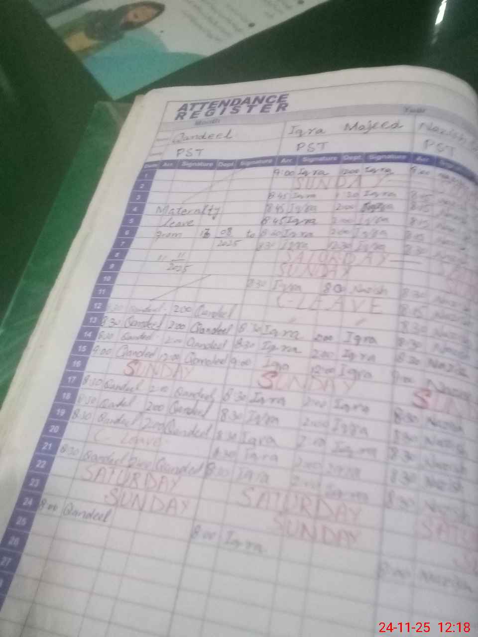| Leave | Duty | Absent | Maternity | Medical | Ex- Pak |