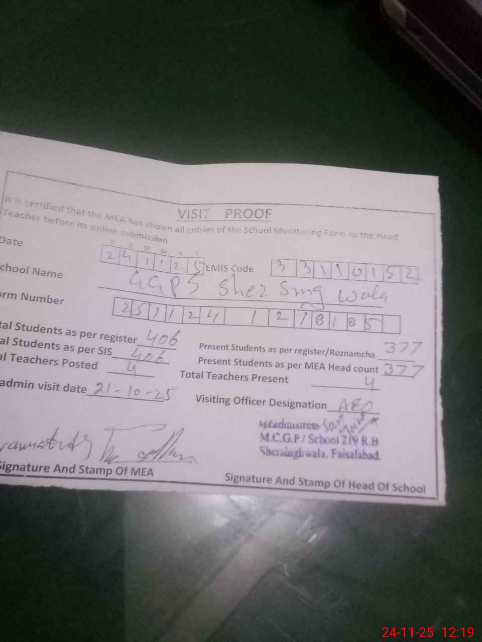 | Attendance Register | Head Teacher | MEA with School | Visit Proof |