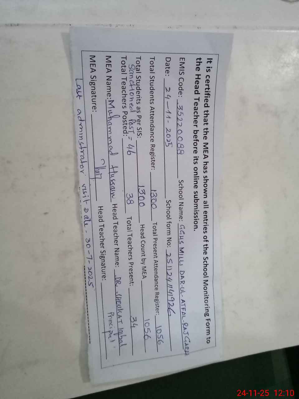 | Remarks (Use Separate Page if Required): 1 Last administrator visit DEO secondary dated 30-7-2025 | |||||
