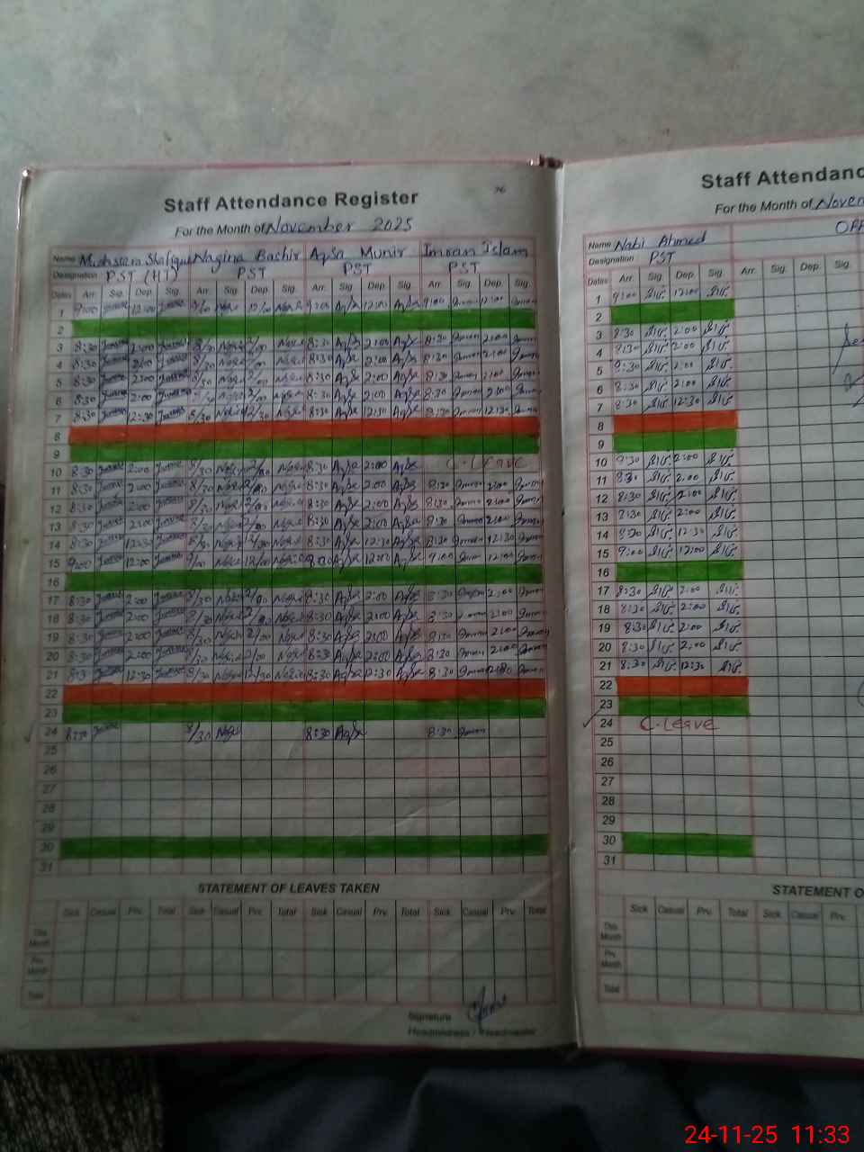 | Leave | Duty | Absent | Maternity | Medical | Ex- Pak |