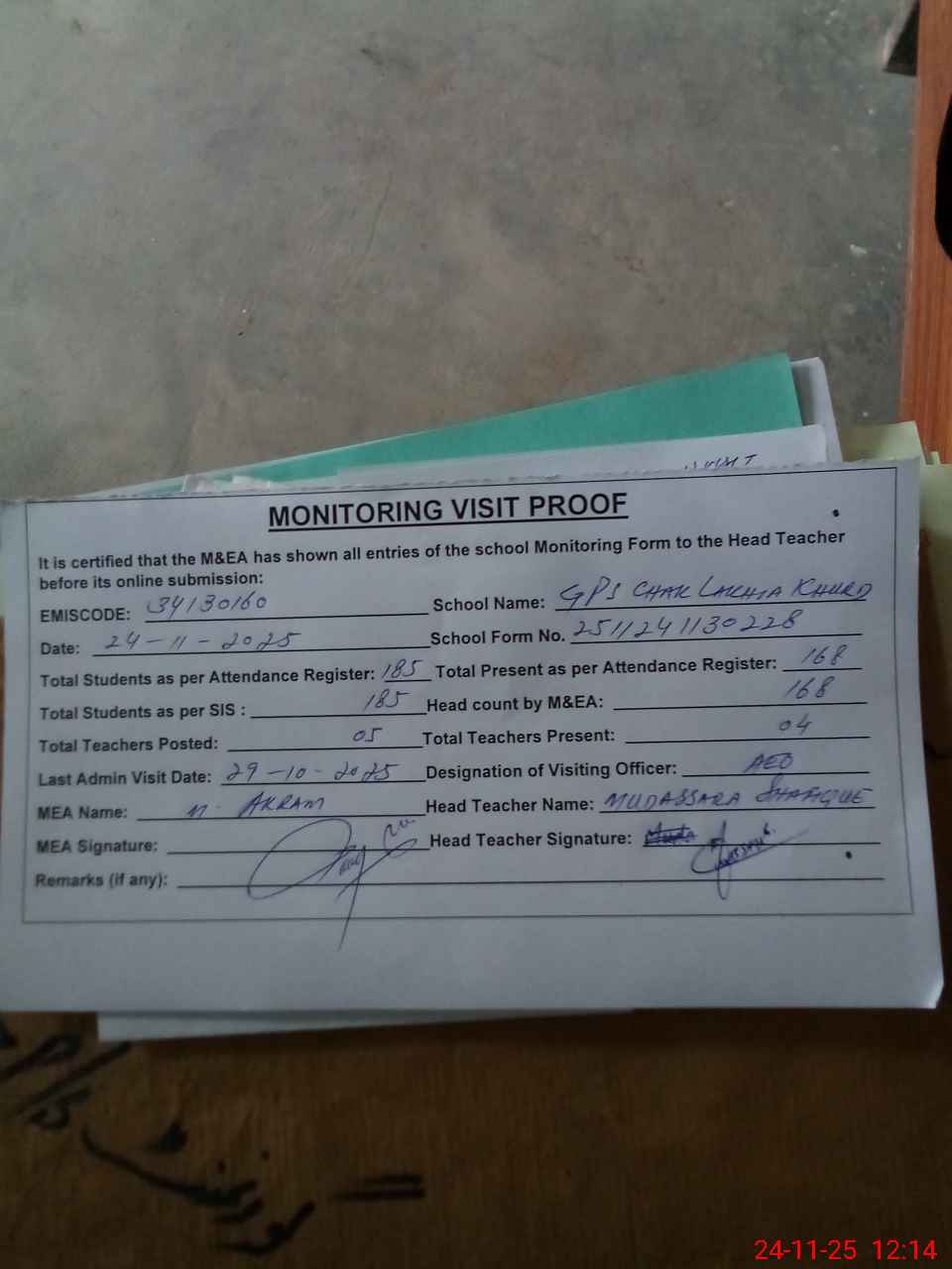 | Attendance Register | Head Teacher | MEA with School | Visit Proof |