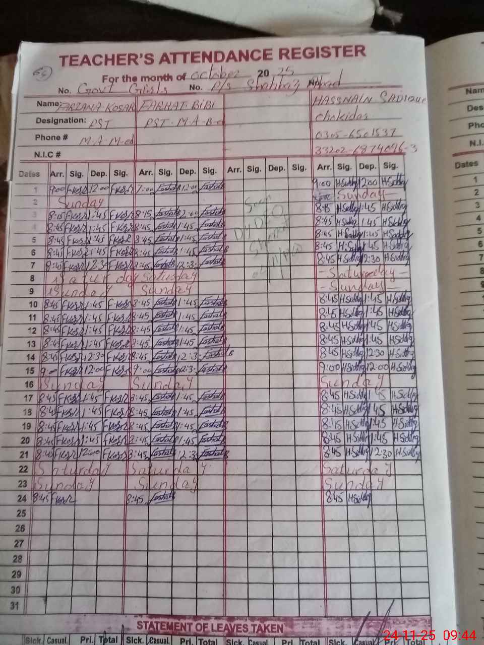 | CNIC | Full Name | Designation | R/C | Absence During Last Calender Month |
