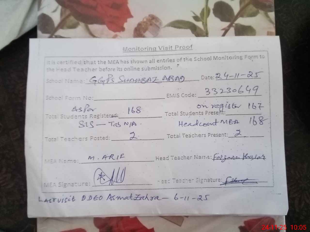 | Attendance Register | Head Teacher | MEA with School | Visit Proof |