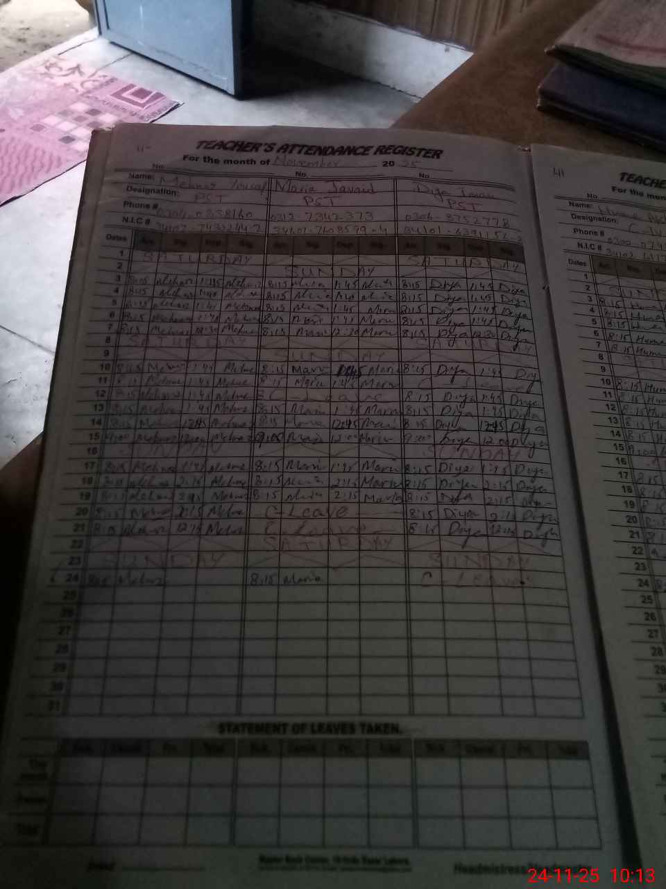 | CNIC | Full Name | Designation | R/C | Absence During Last Calender Month |