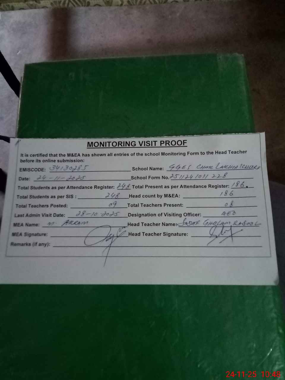 | Attendance Register | Head Teacher | MEA with School | Visit Proof |