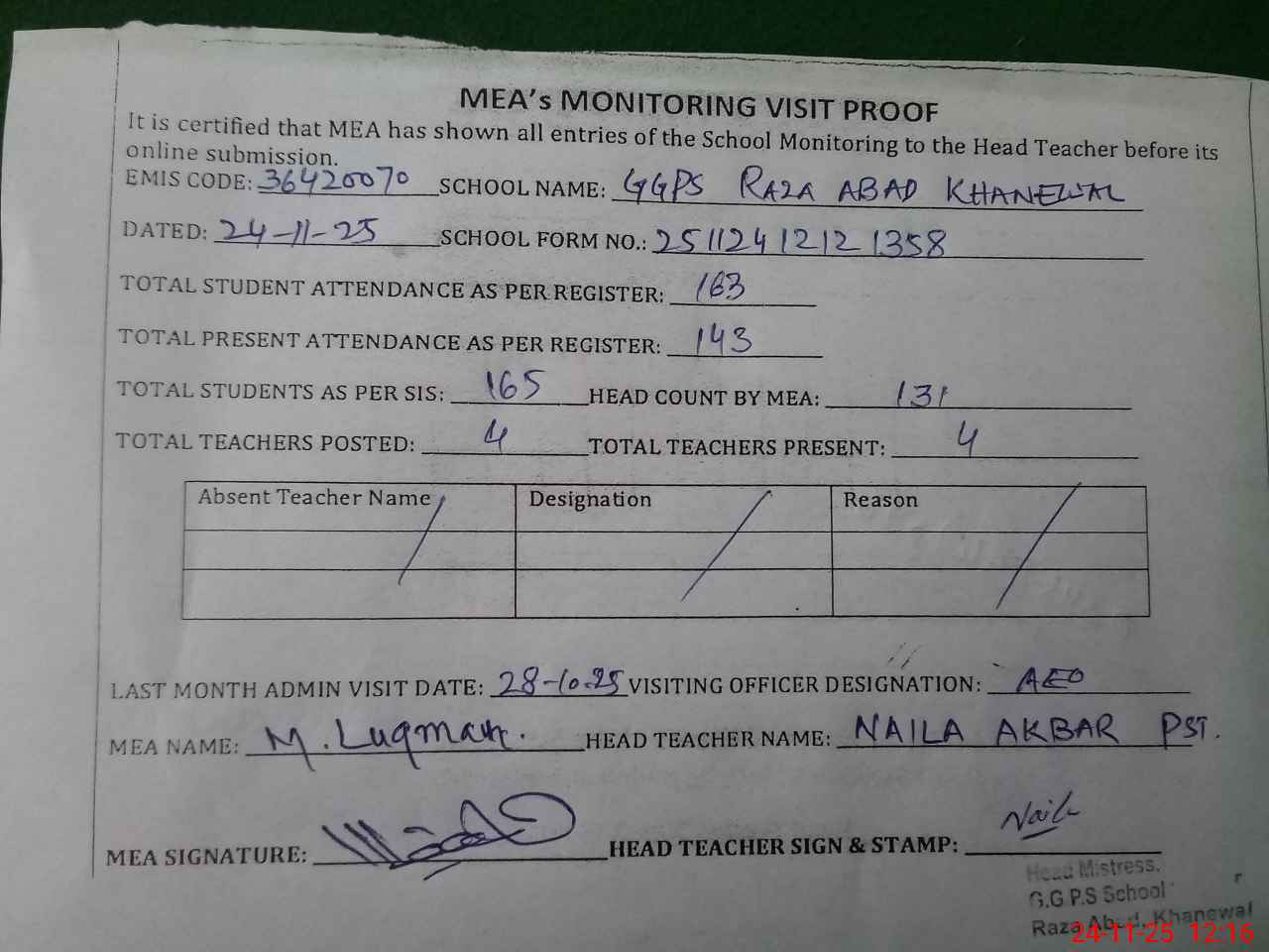 | Attendance Register | Head Teacher | MEA with School | Visit Proof |