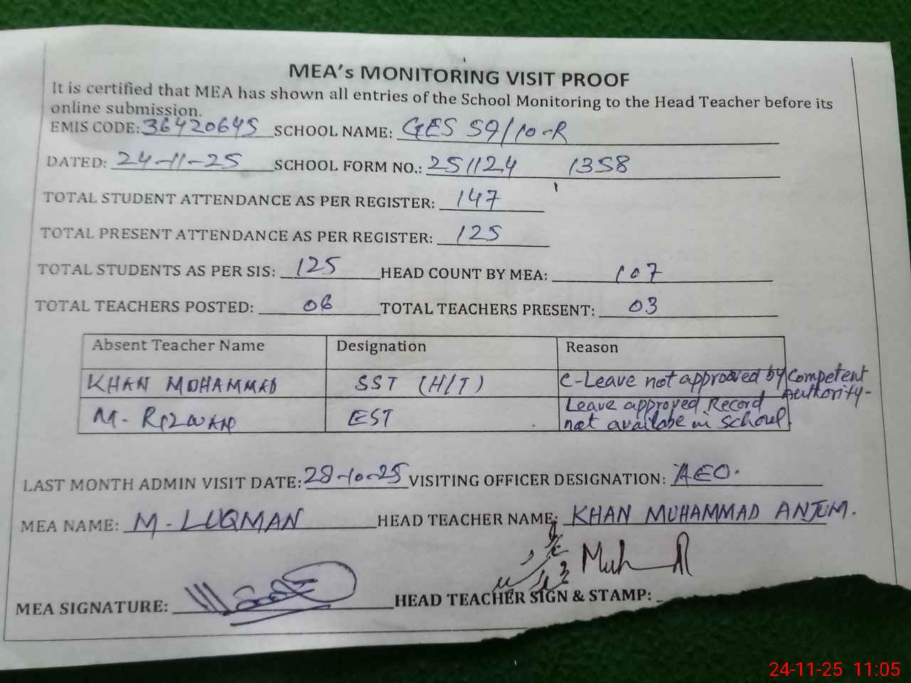 | Attendance Register | Head Teacher | MEA with School | Visit Proof |