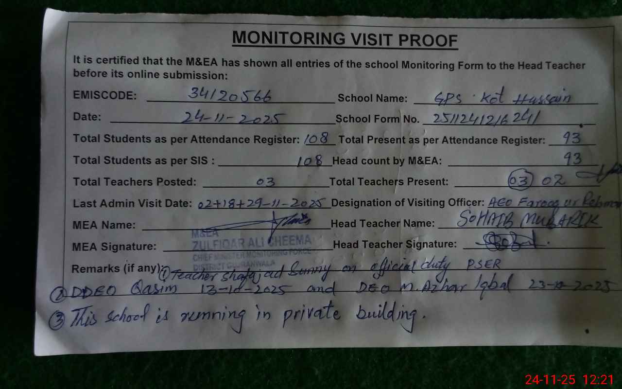 | EMIS Code: 34120566 | Name of School: GPS KOT HUSSAIN | |||