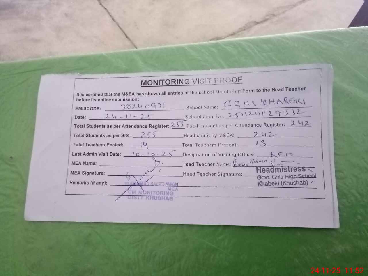 | Remarks (Use Separate Page if Required): Students on SIS QTY 255 Last admin visit On 10 October 2025 by AEO | |||||