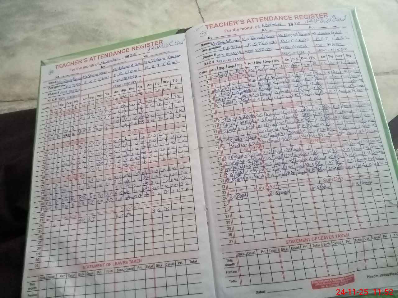 | CNIC | Full Name | Designation | R/C | Absence During Last Calender Month |