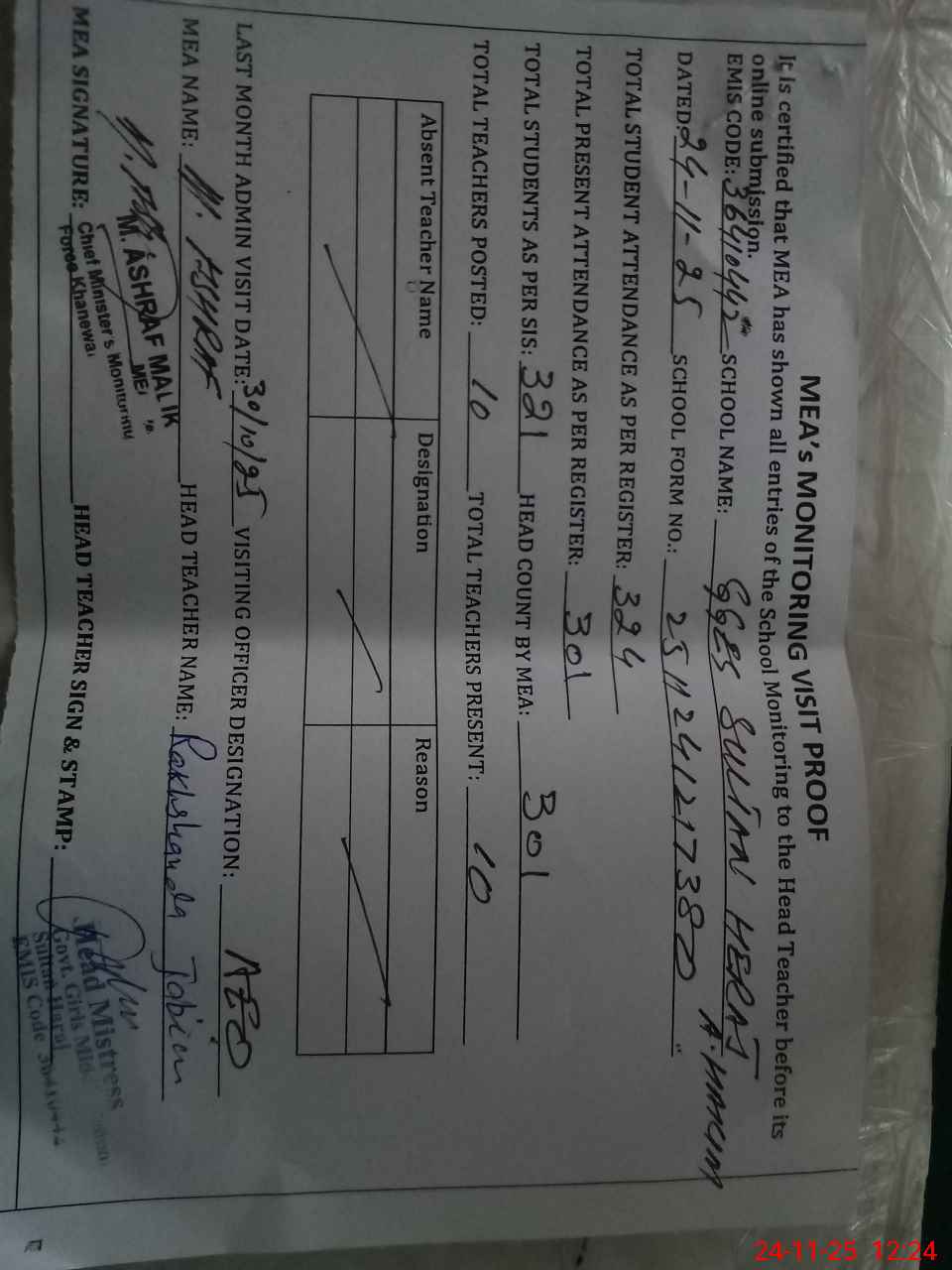 | Attendance Register | Head Teacher | MEA with School | Visit Proof |