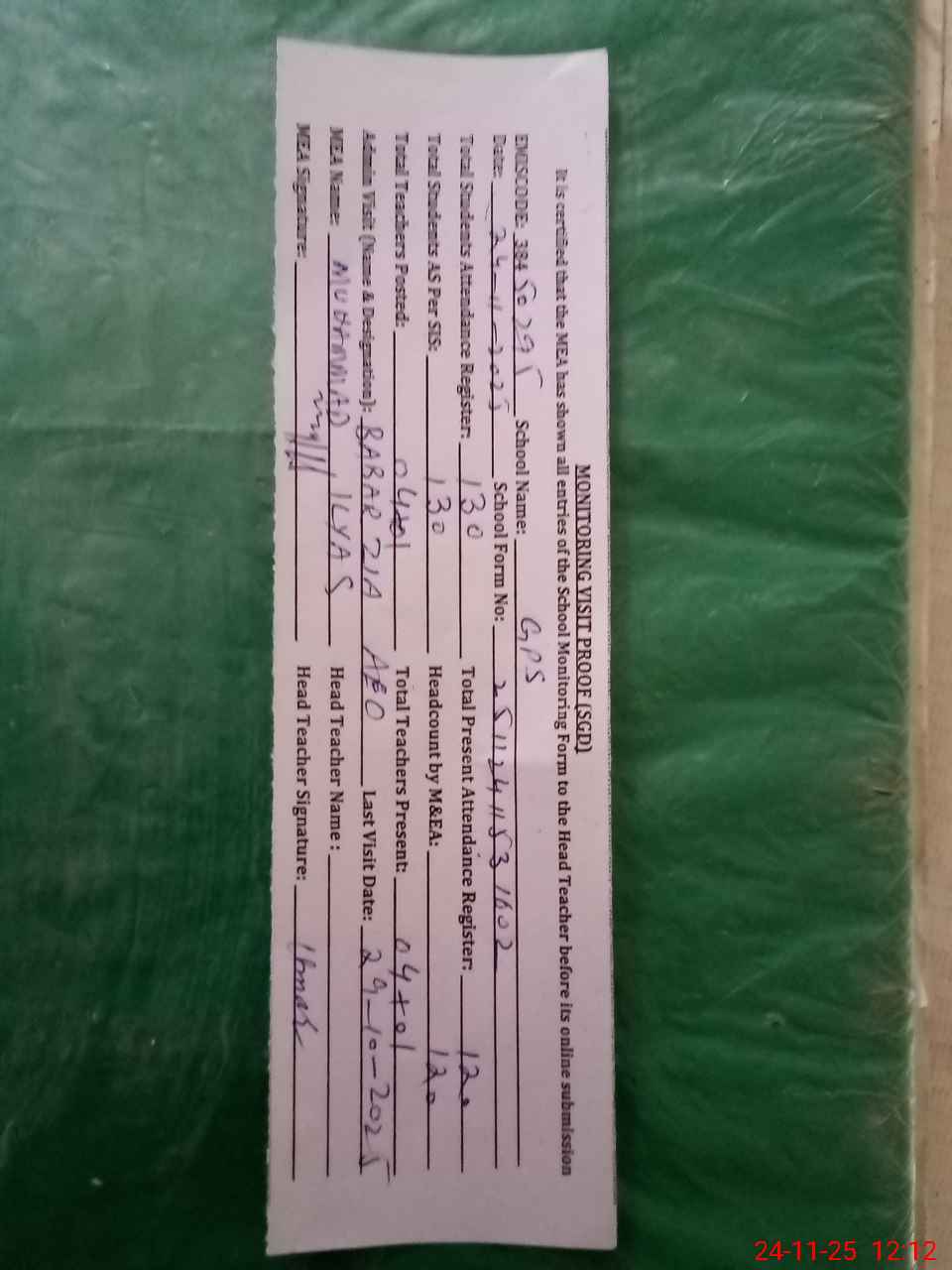 | Attendance Register | Head Teacher | MEA with School | Visit Proof |