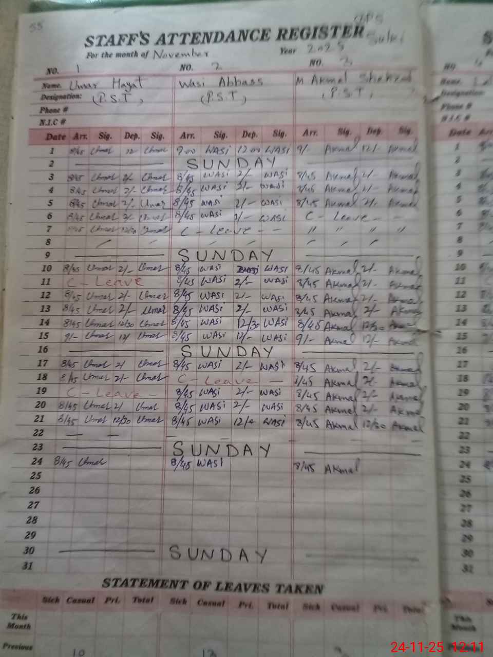 | CNIC | Full Name | Designation | R/C | Absence During Last Calender Month |