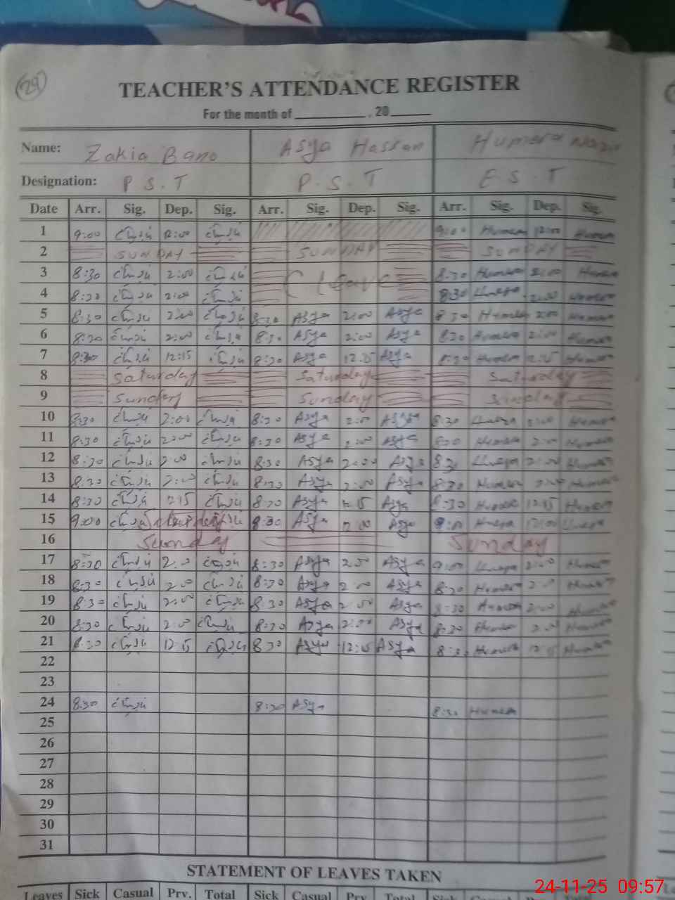 | Leave | Duty | Absent | Maternity | Medical | Ex- Pak |
