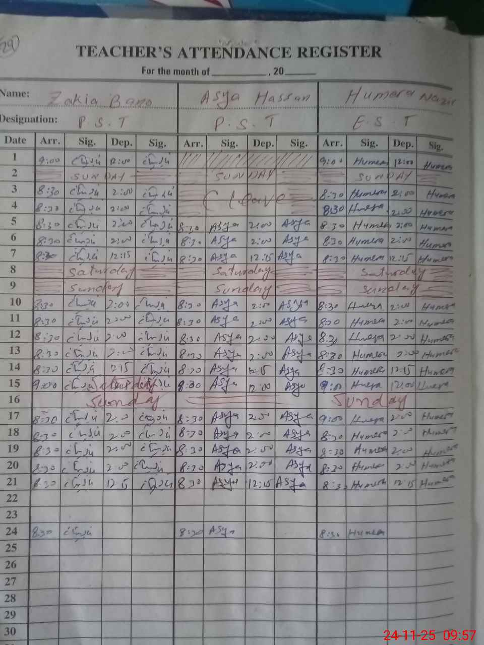 | CNIC | Full Name | Designation | R/C | Absence During Last Calender Month |