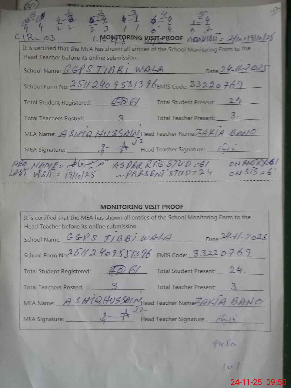 | Attendance Register | Head Teacher | MEA with School | Visit Proof |