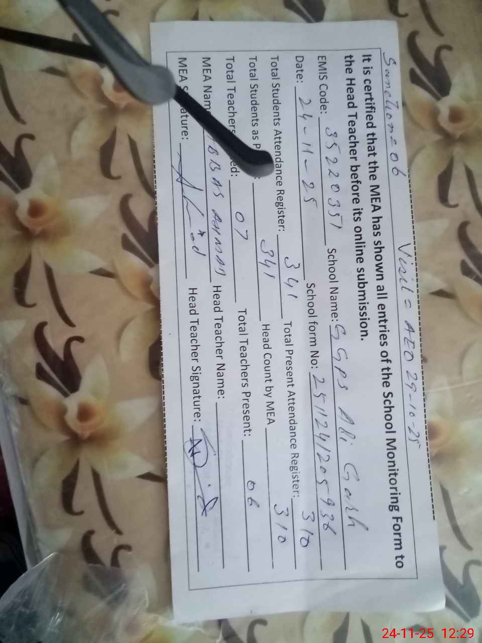 | Attendance Register | Head Teacher | MEA with School | Visit Proof |