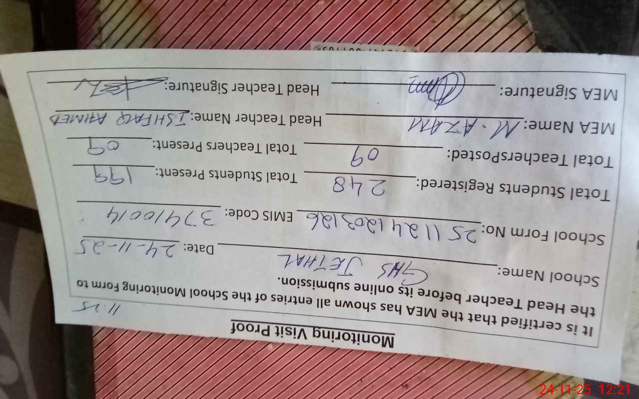 | Name: Is**** Ah**** Designation: (School Headmaster's/Headmistress's) HEADMASTER Phone/Cell Number: 03**** |