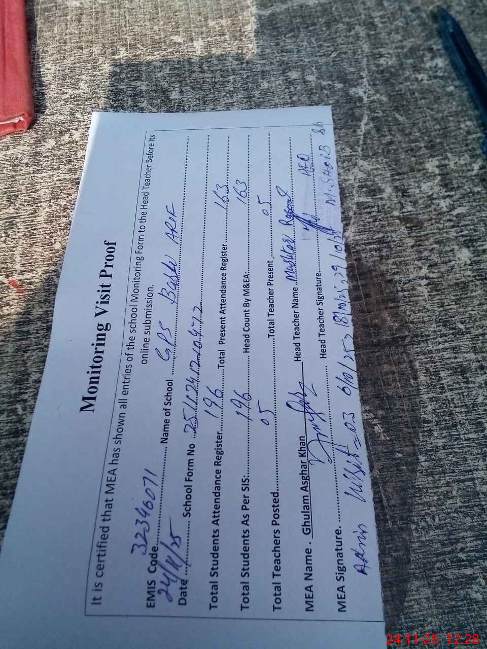 | Attendance Register | Head Teacher | MEA with School | Visit Proof |