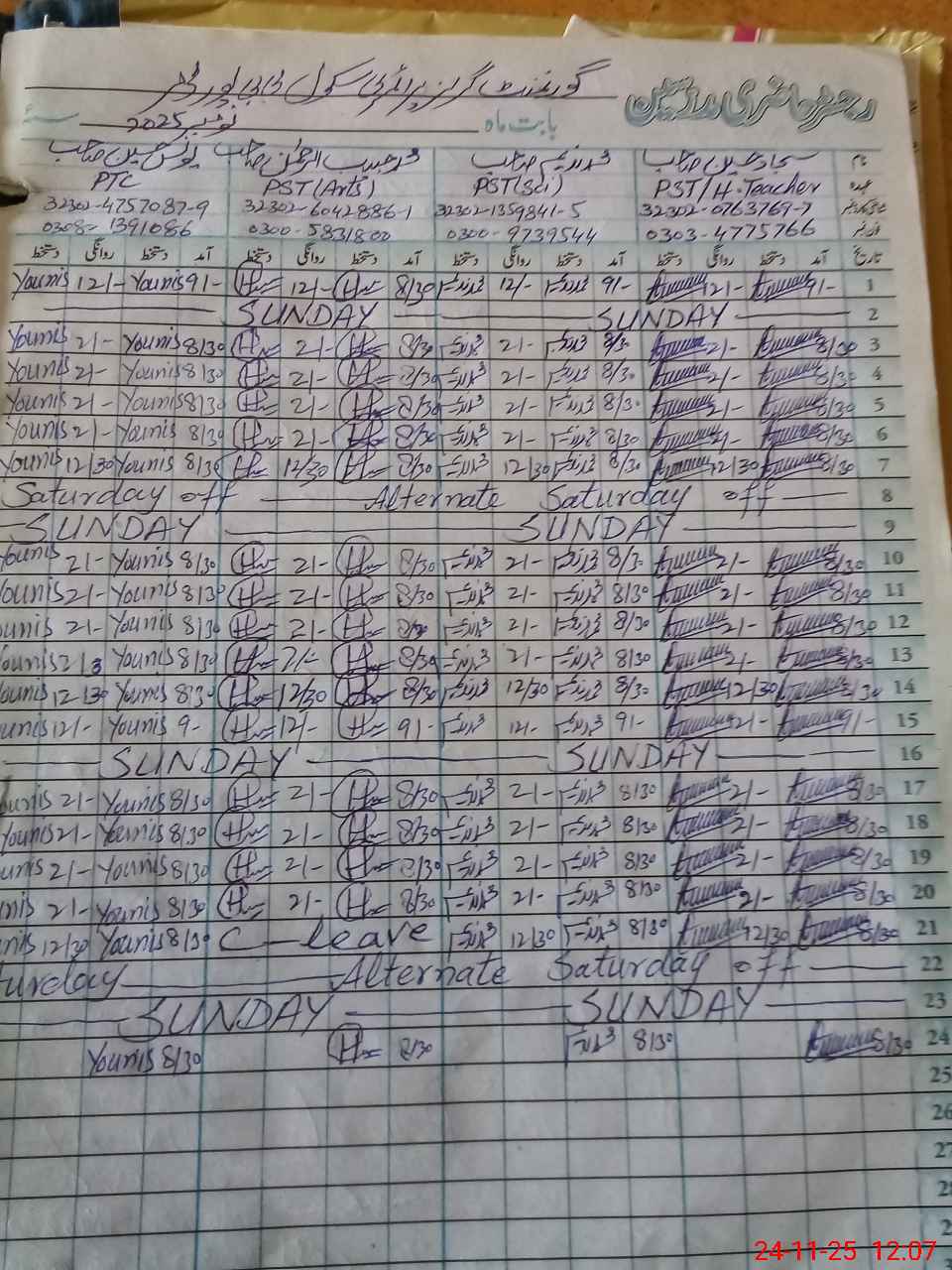 | CNIC | Full Name | Designation | R/C | Absence During Last Calender Month |