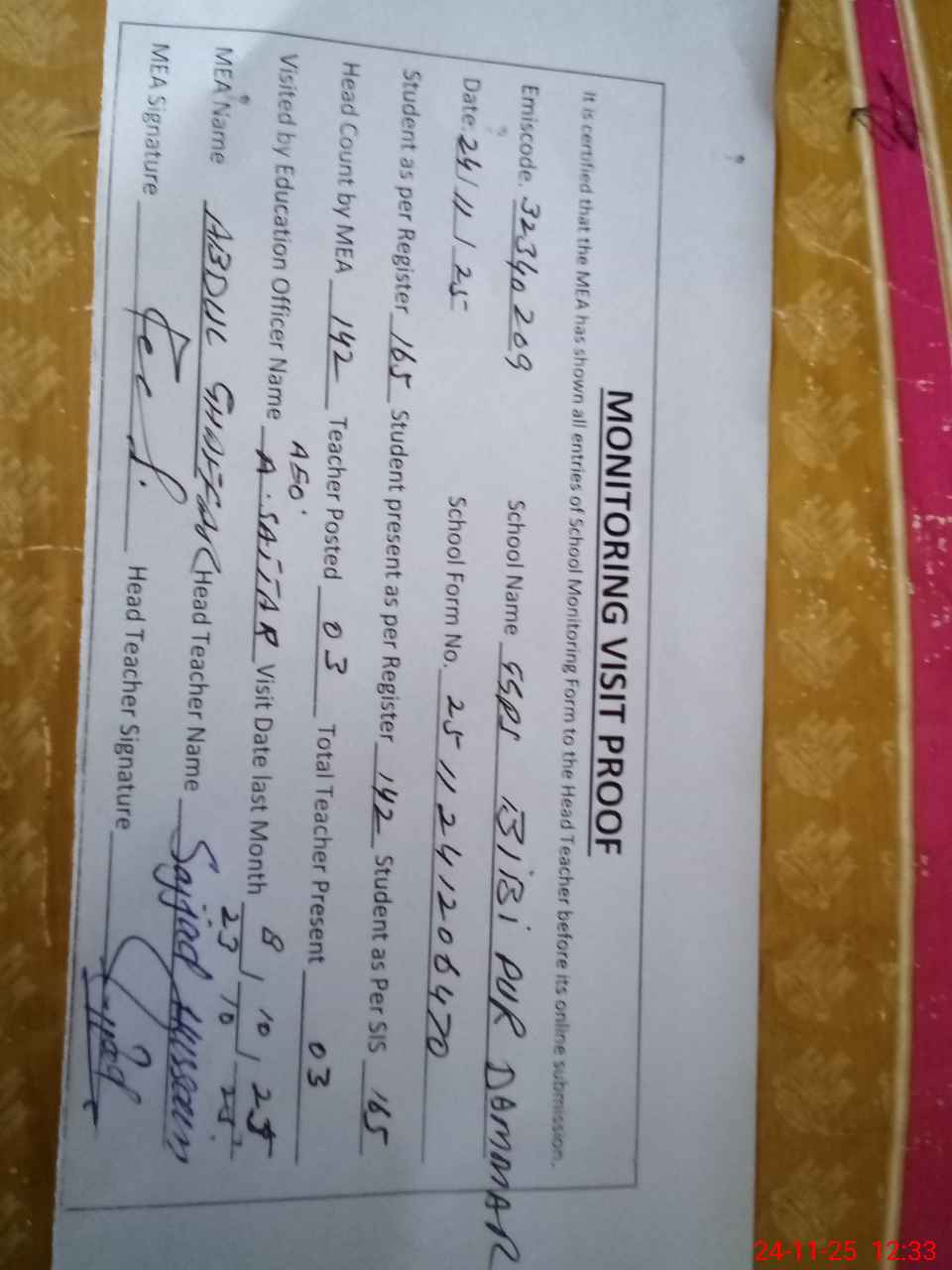 | Attendance Register | Head Teacher | MEA with School | Visit Proof |