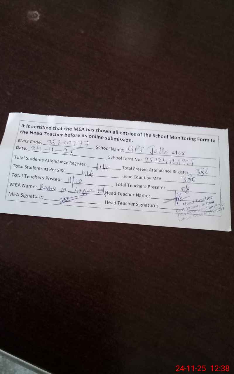 | Remarks (Use Separate Page if Required): School Visit Report School Name: GPS Jallo Mor EMIS Code: 35210227 During the visit, the following observations were made: 1. The school is facing a shortage of student furniture. In many cases, four students are sitting on a single bench. 2. Teacher Farheen (PST) had two small children with her in the classroom, and no accompanying person was present. This situation was causing disturbance to the other students. 3. Teacher Saima (PST) was found using/holding a mobile phone inside the classroom while students were seated. These issues require attention for smooth academic functioning | |||||