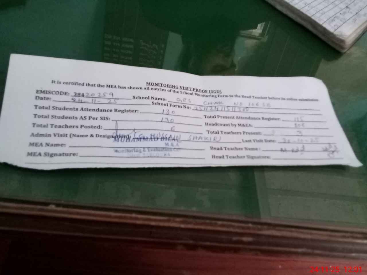 | Attendance Register | Head Teacher | MEA with School | Visit Proof |