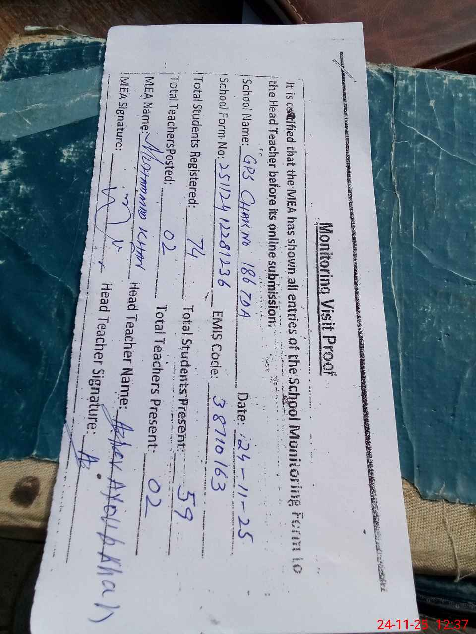 | Attendance Register | Head Teacher | MEA with School | Visit Proof |