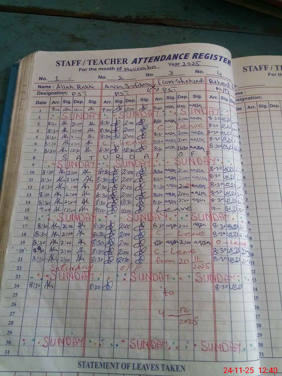 | Remarks (Use Separate Page if Required): Total sanctioned seats Teachers 04 and filled seats 03 AEO visit date 10 and 22 October 2025 | |||||