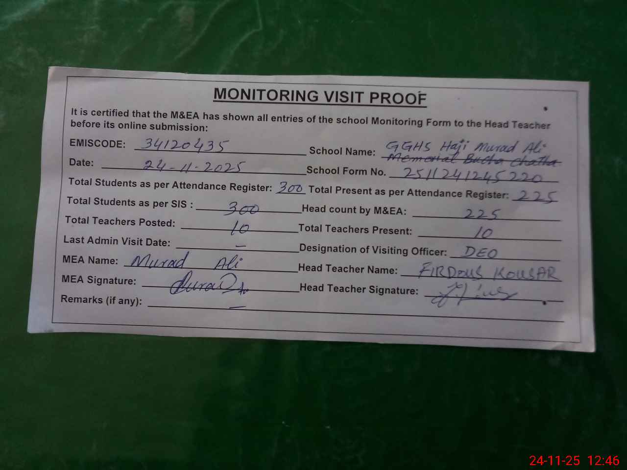 | Certified that this School was Inspected by the Undersigned MEA/DMO Today and the Information Stated Above is as Per Record. | |||||