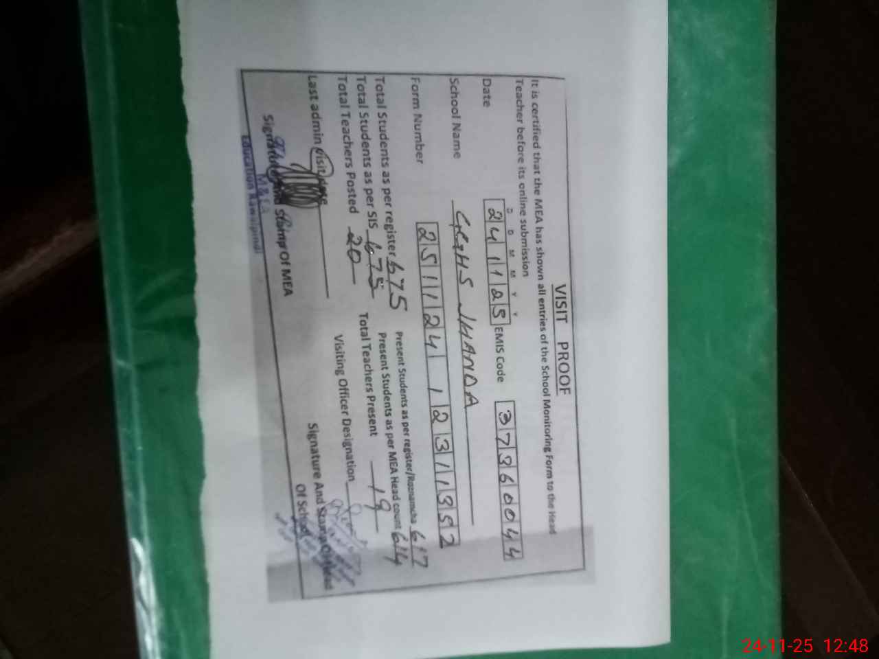 | Attendance Register | Head Teacher | MEA with School | Visit Proof |