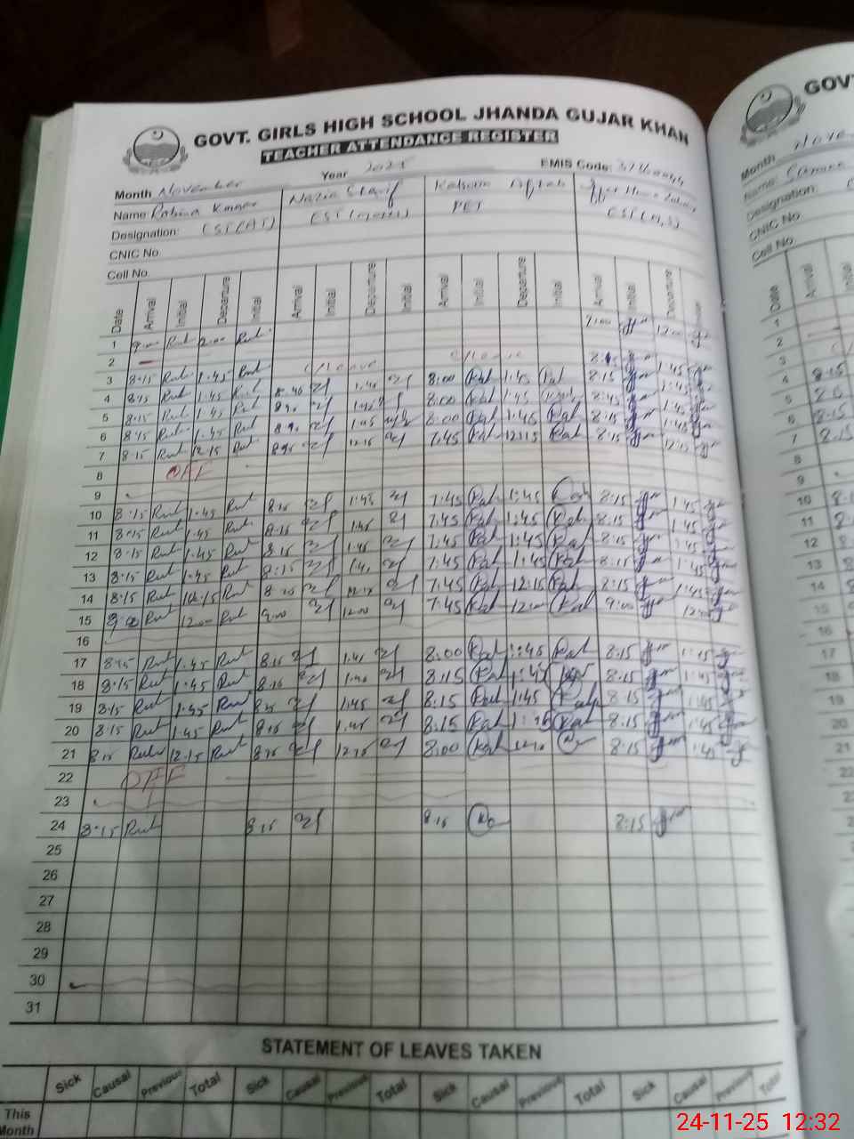 | CNIC | Full Name | Designation | R/C | Absence During Last Calender Month |
