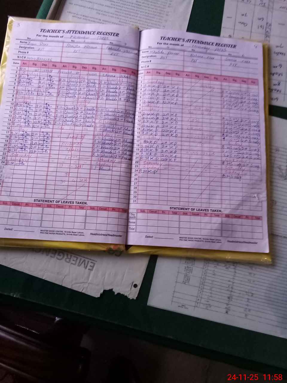 | CNIC | Full Name | Designation | R/C | Absence During Last Calender Month |