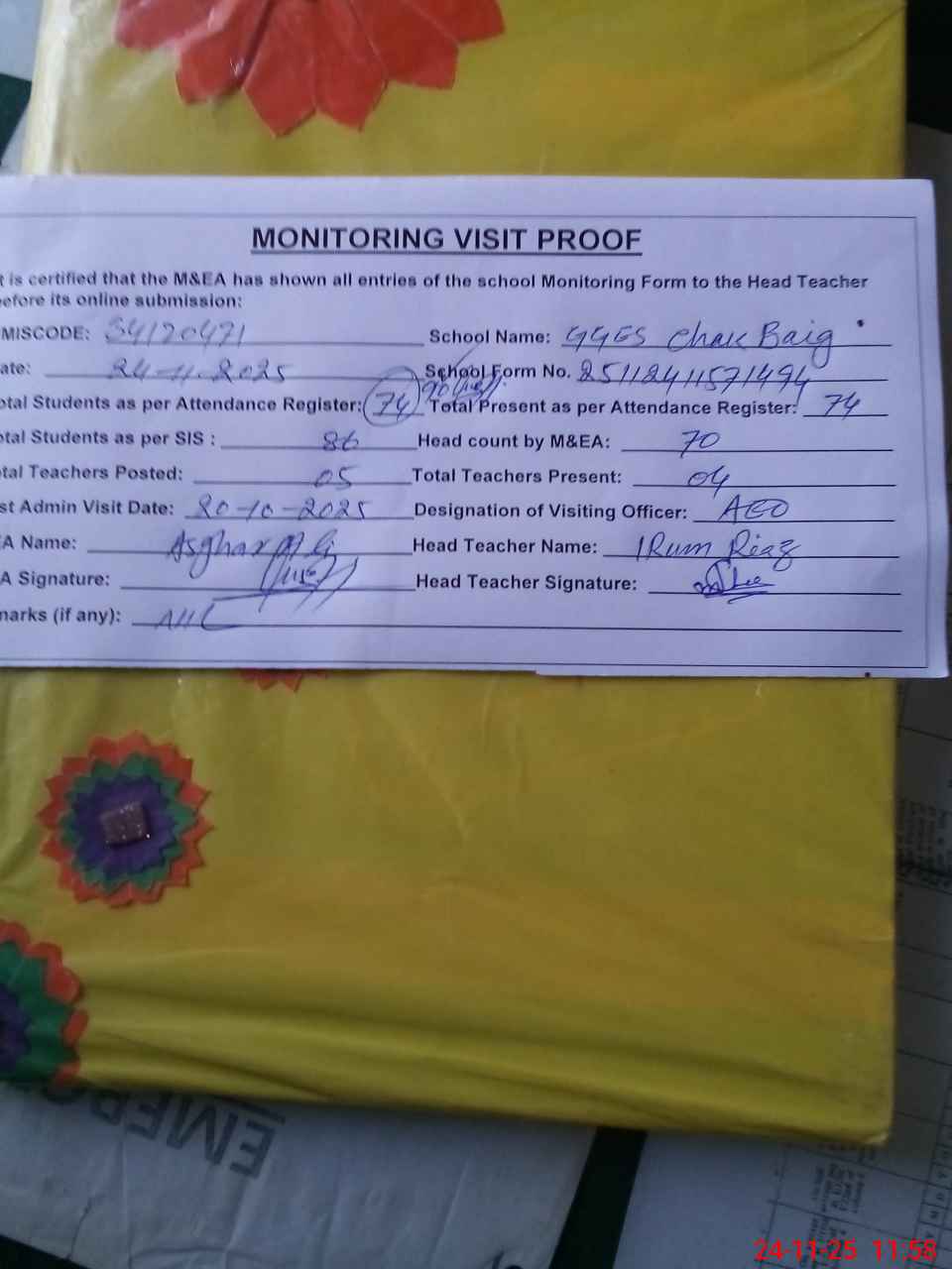 | Attendance Register | Head Teacher | MEA with School | Visit Proof |