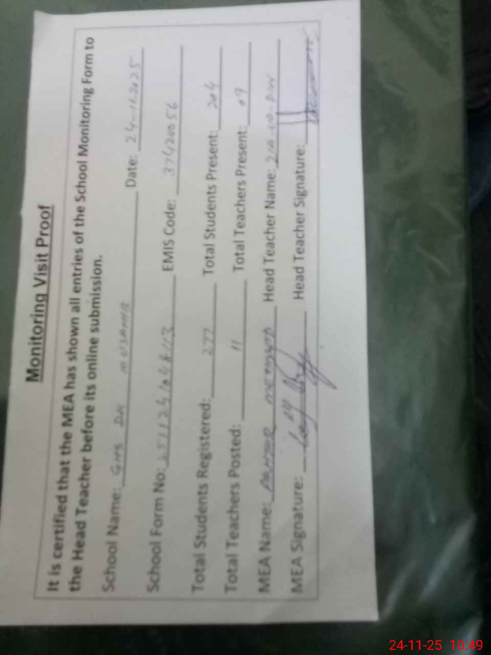 | Attendance Register | Head Teacher | MEA with School | Visit Proof |