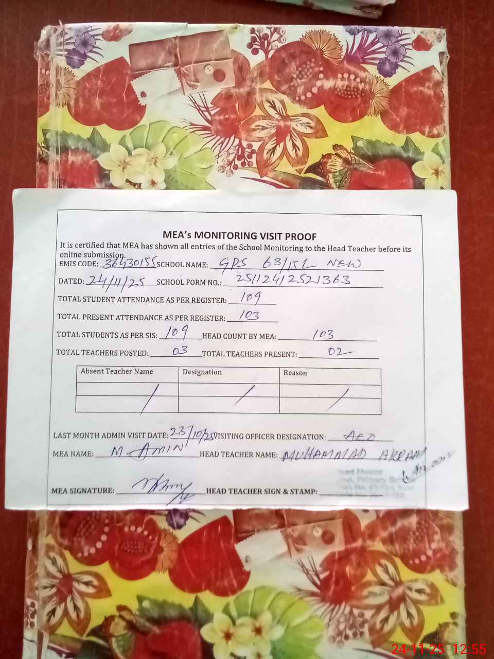 | Attendance Register | Head Teacher | MEA with School | Visit Proof |