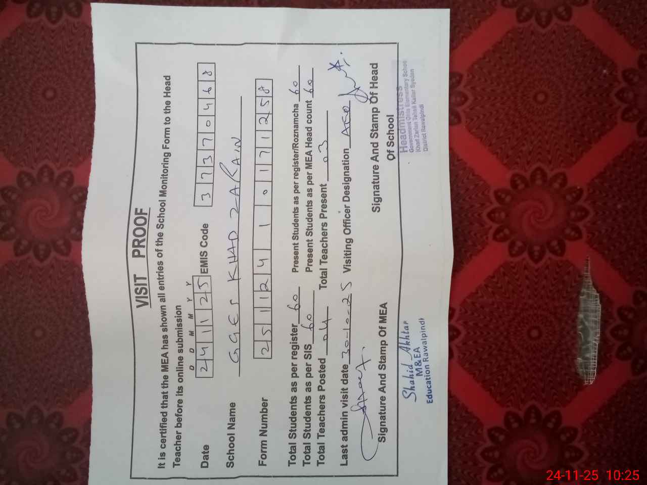 | Attendance Register | Head Teacher | MEA with School | Visit Proof |