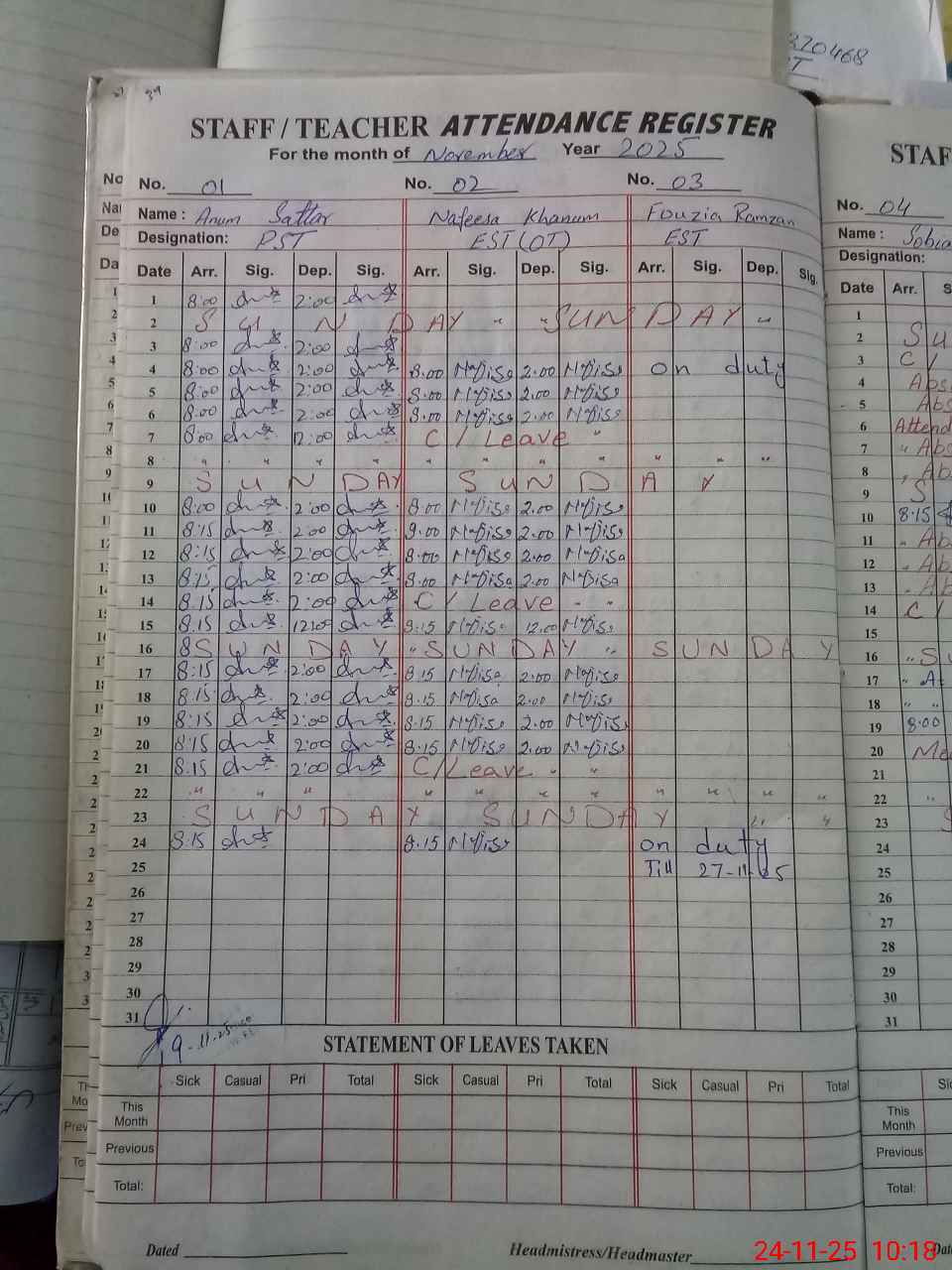 | Leave | Duty | Absent | Maternity | Medical | Ex- Pak |