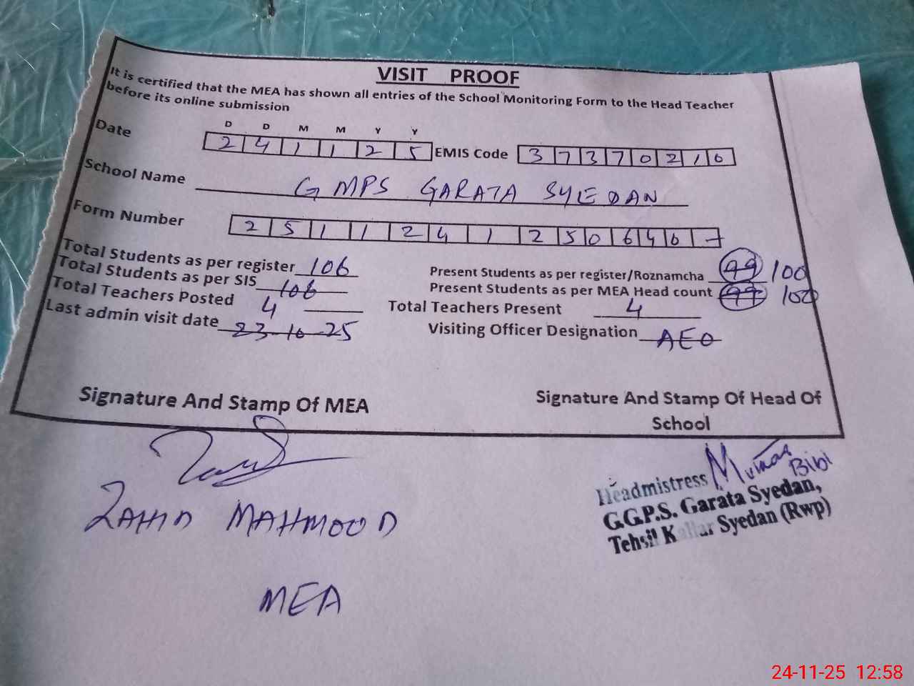 | Attendance Register | Head Teacher | MEA with School | Visit Proof |