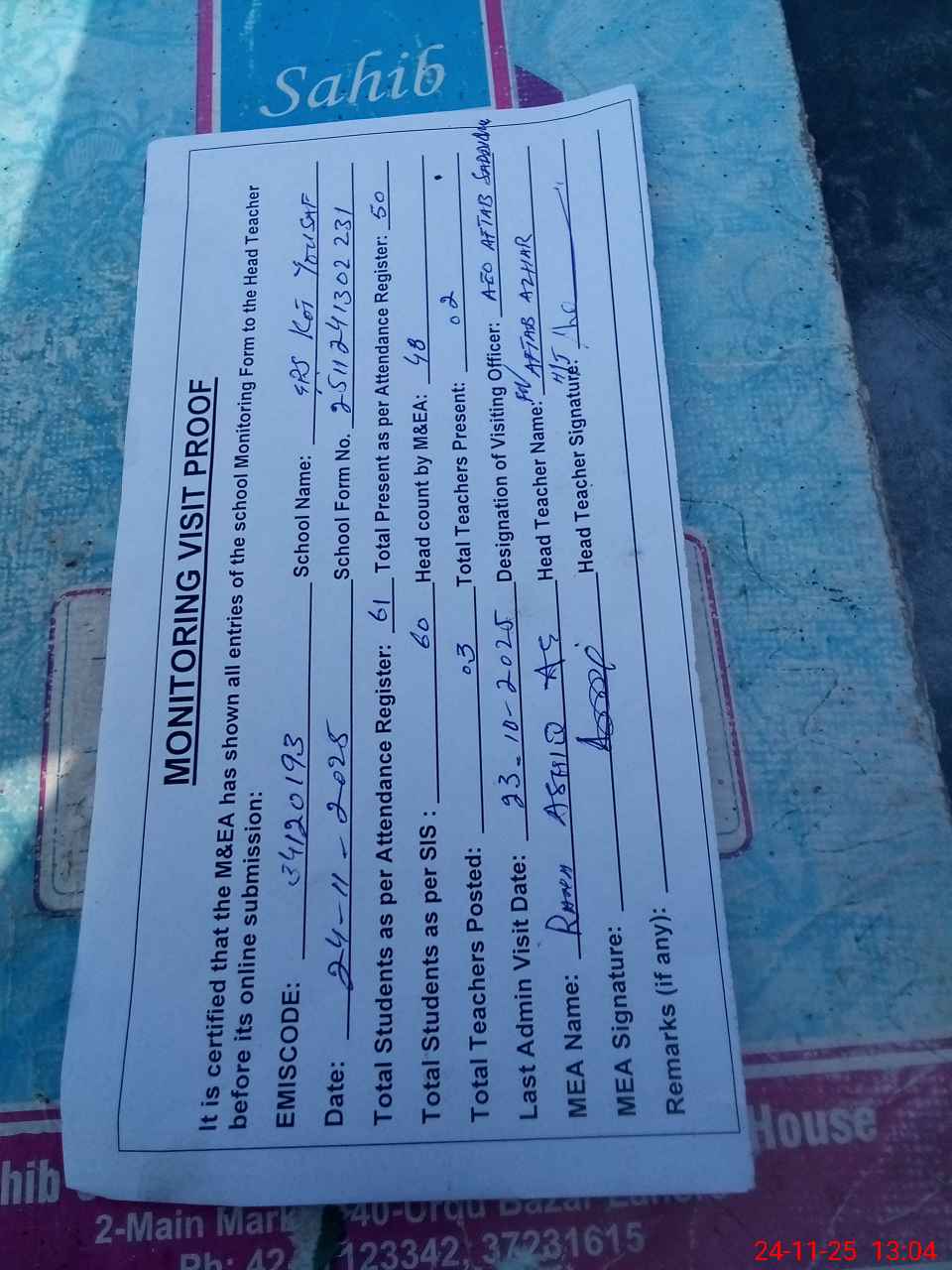 | Attendance Register | Head Teacher | MEA with School | Visit Proof |