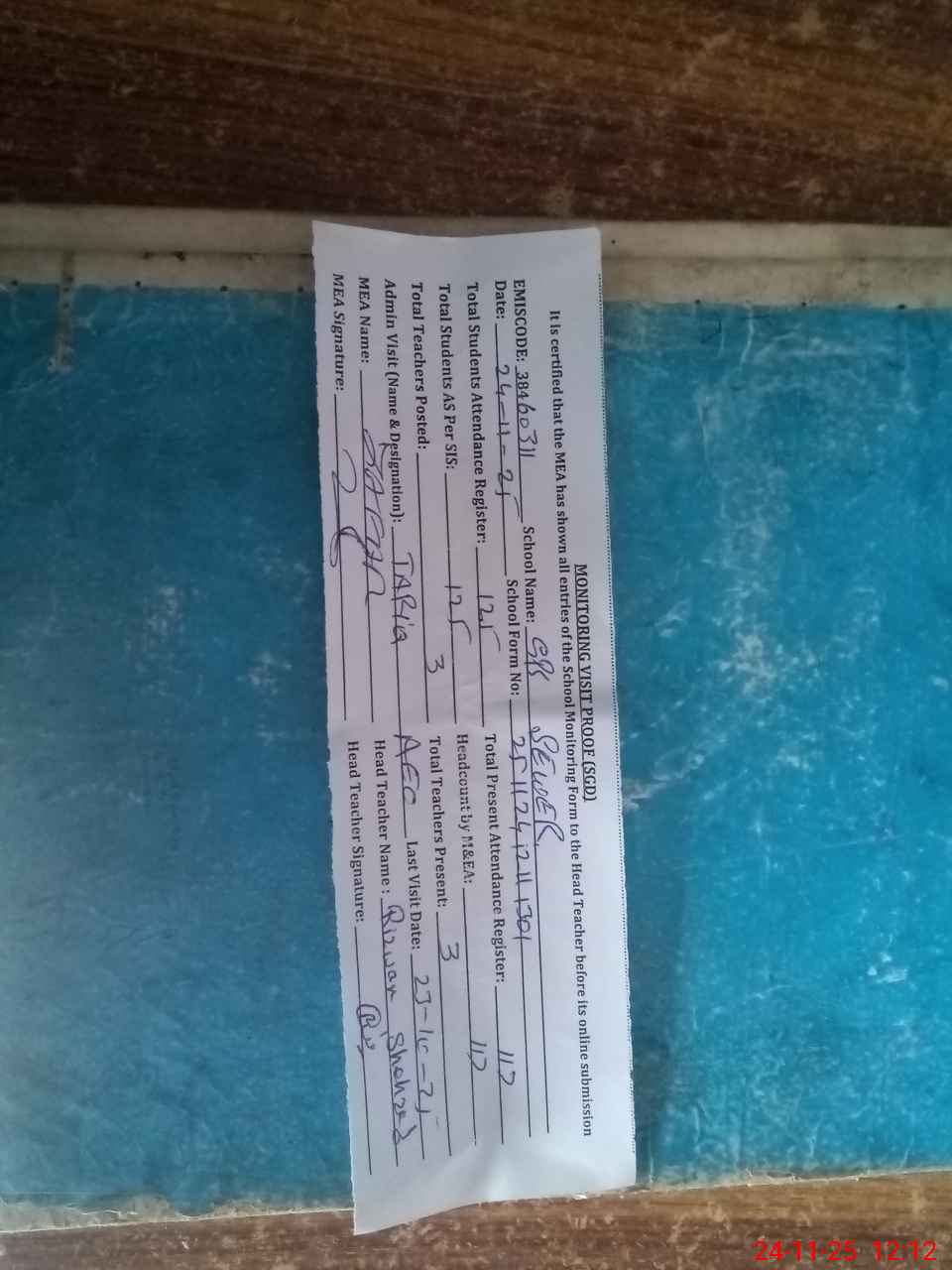| Attendance Register | Head Teacher | MEA with School | Visit Proof |