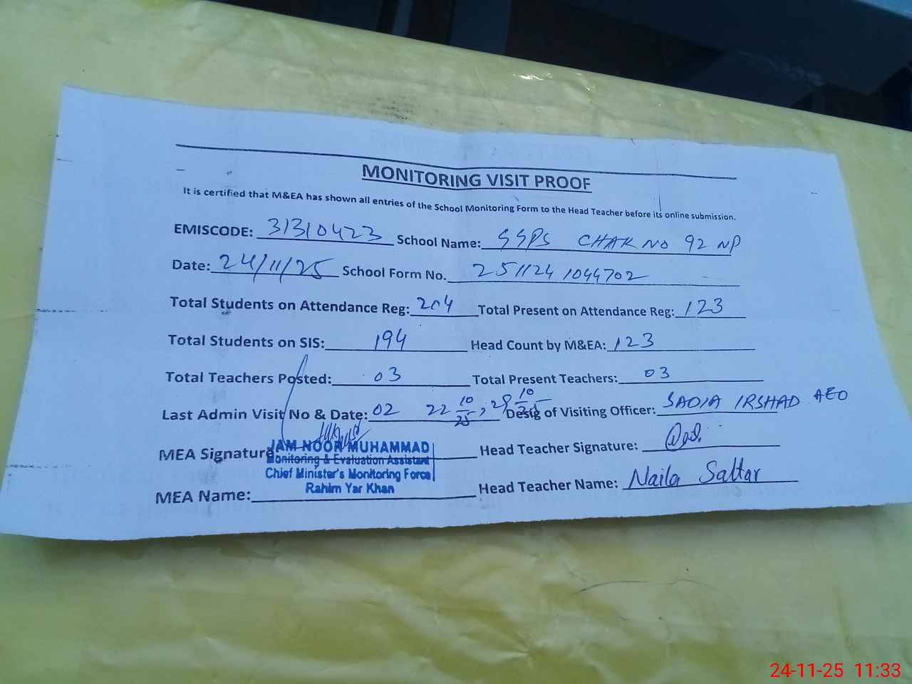 | Attendance Register | Head Teacher | MEA with School | Visit Proof |