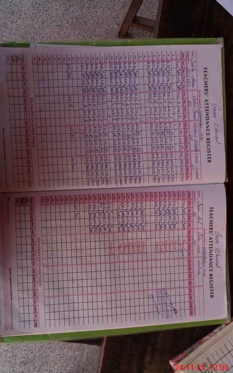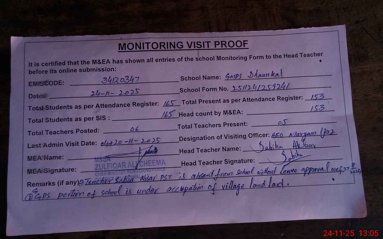 | Remarks (Use Separate Page if Required): 1 Teacher Sobia Nisar is absent from school without leave approval wef 27 August,2024 2 GGPS portion of school is under occupied by an village land lard . | |||||
