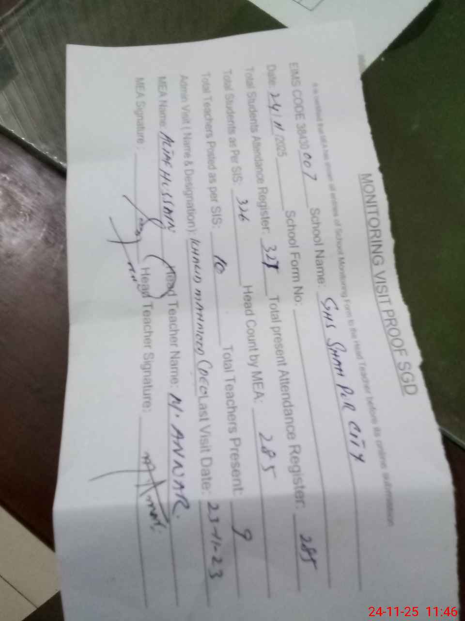 | Attendance Register | Head Teacher | MEA with School | Visit Proof |
