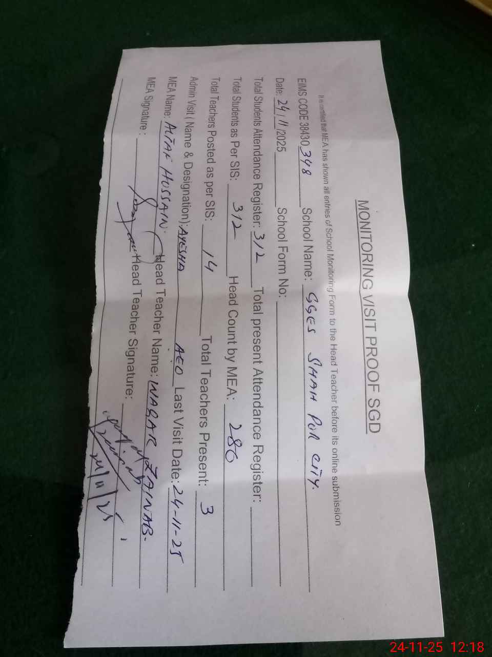 | Attendance Register | Head Teacher | MEA with School | Visit Proof |