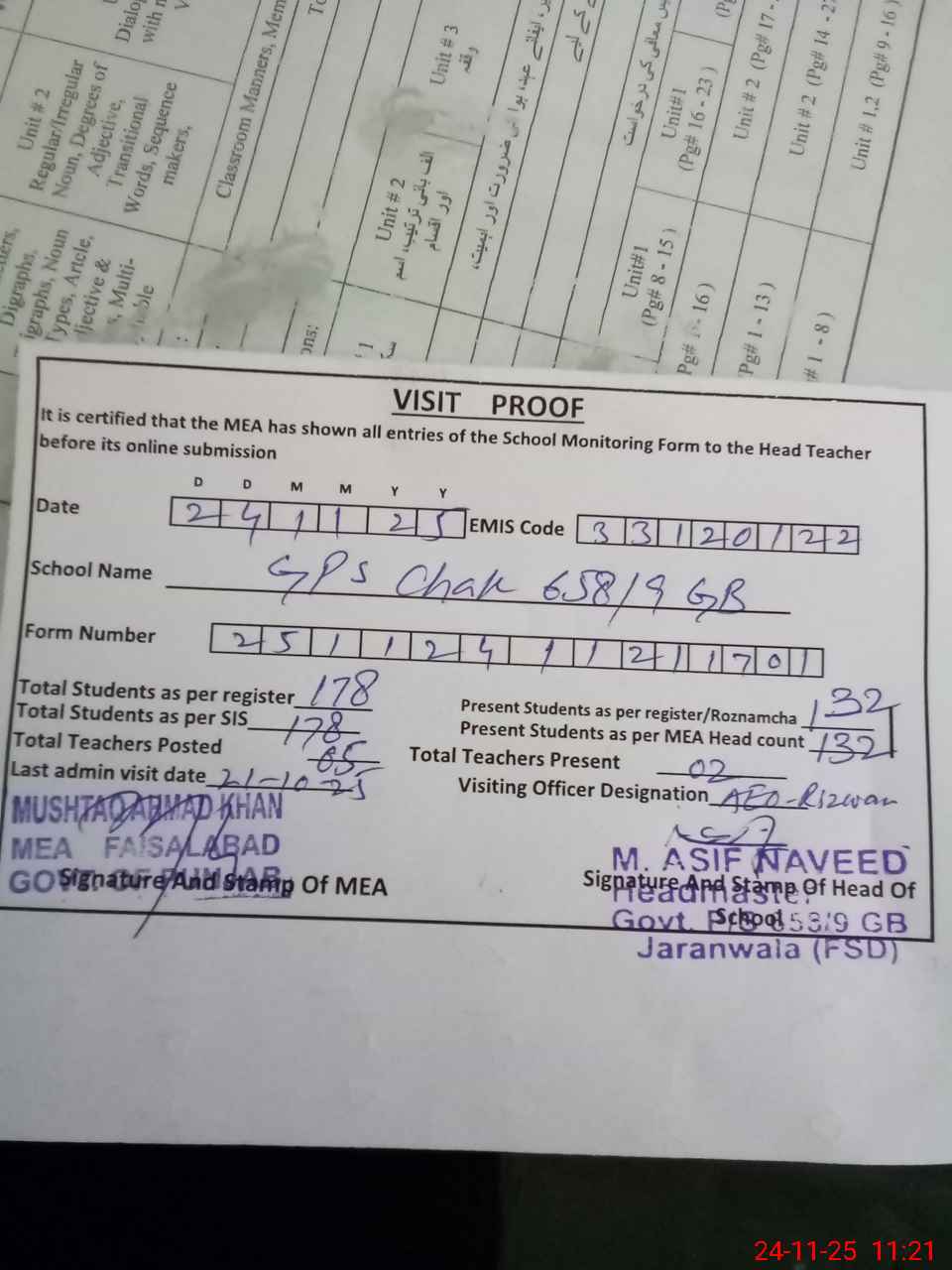 | Attendance Register | Head Teacher | MEA with School | Visit Proof |