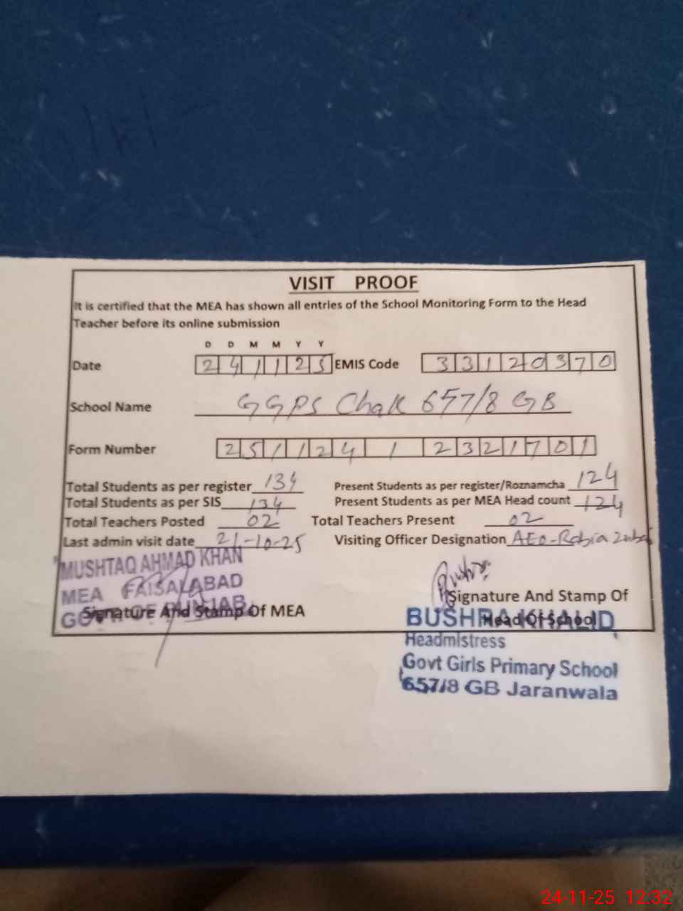 | EMIS Code: 33120370 | Name of School: GGPS CHAK 657/8 GB JARANWALA | |||