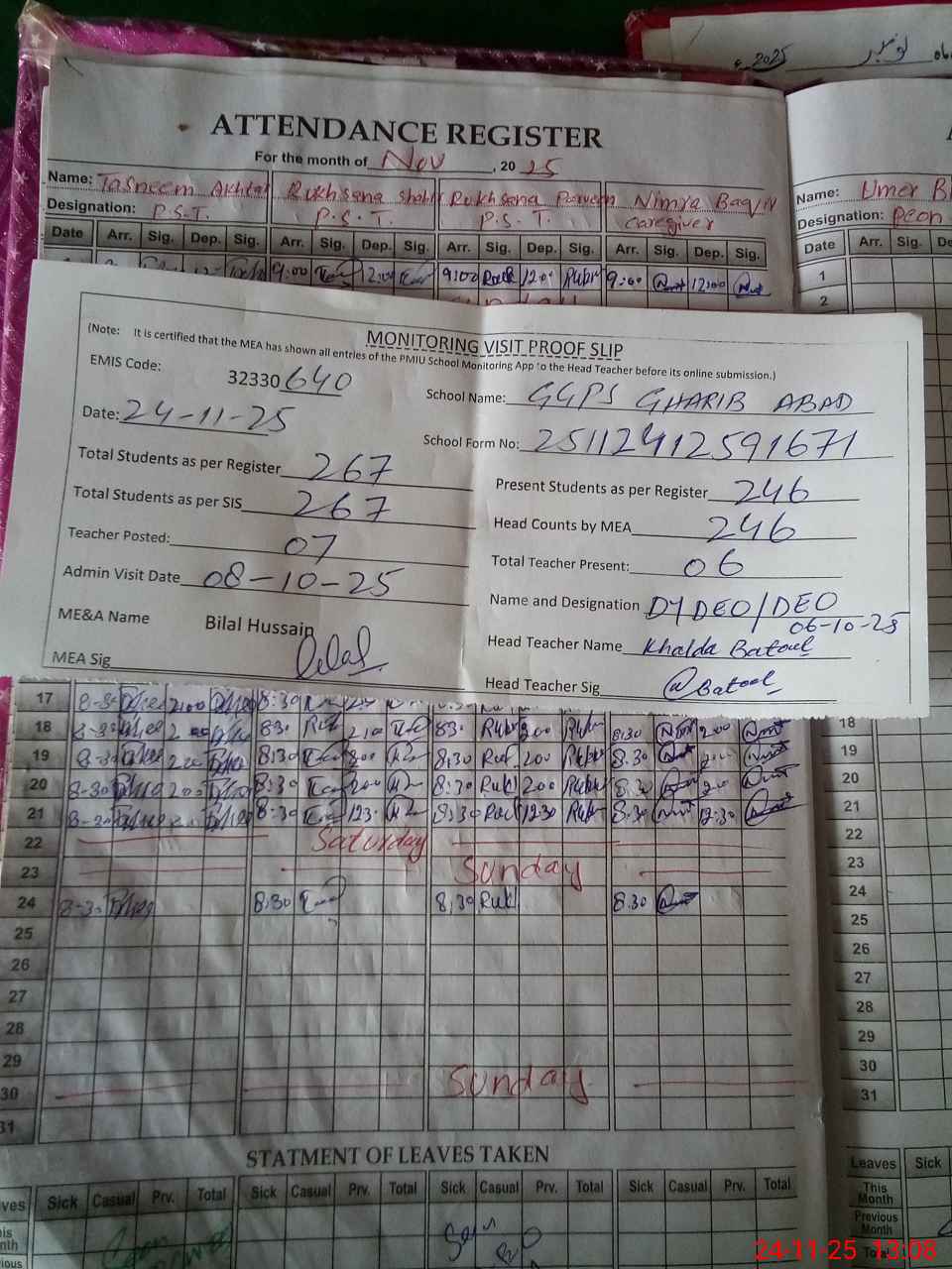 | Attendance Register | Head Teacher | MEA with School | Visit Proof |